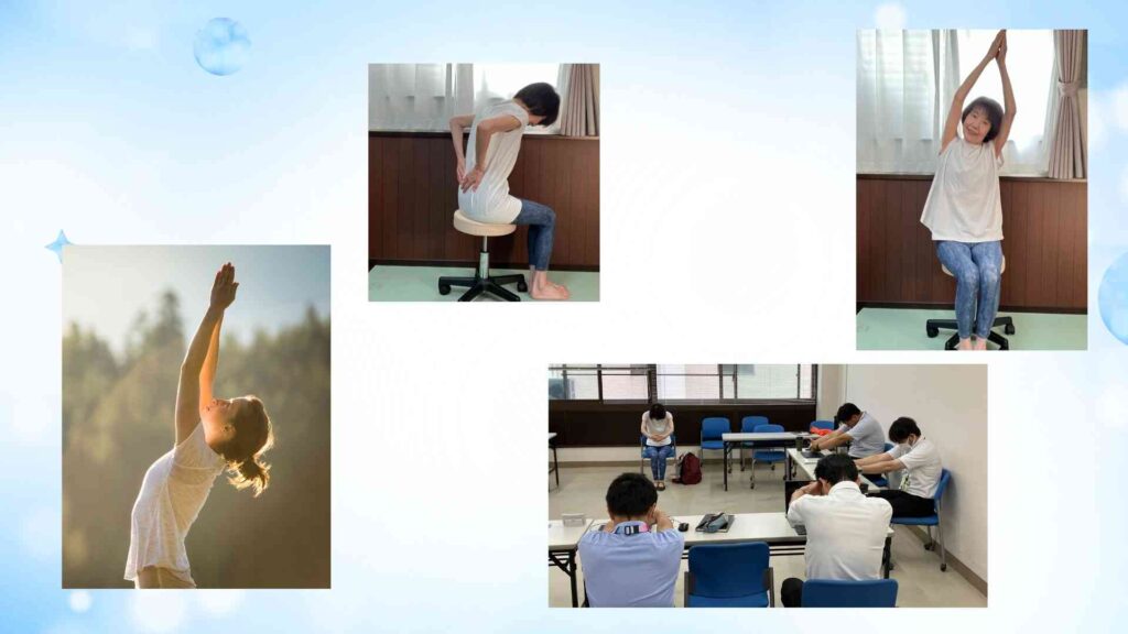オフィスでチョアヨガ体験ありがとうございました。先生のゆったりした言葉かけで、自分の体や呼吸を意識して過ごすことができました。慌ただしい時間を過ごすからこそ自分の体の状態を学んだり、メンテナンスする意識を高めたりすることの大切さにも気づきました。