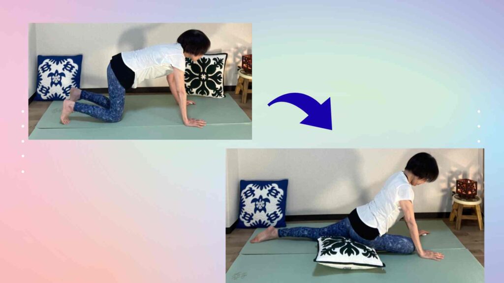 ❶クッションを用意して、よつばいの姿勢からスタート。